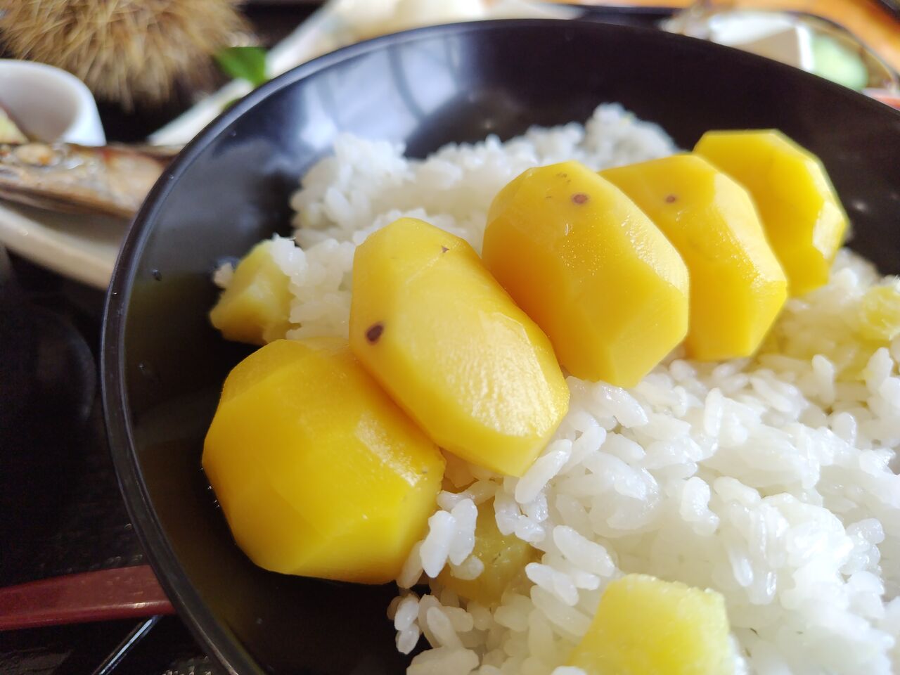 ご飯にはさつまいもと栗が混ぜ込まれてます。